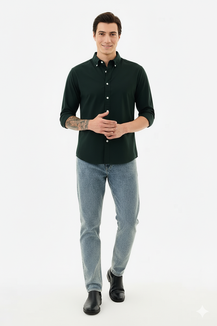 Crafted from high-quality, breathable fabric, the shirt feels soft on the skin while offering excellent durability for daily use. The deep forest green colour adds a refined, masculine touch, making it suitable for both casual outings and smart-casual occasions. Its slim-fit silhouette enhances the body shape, giving a polished appearance whether worn tucked in or left open.