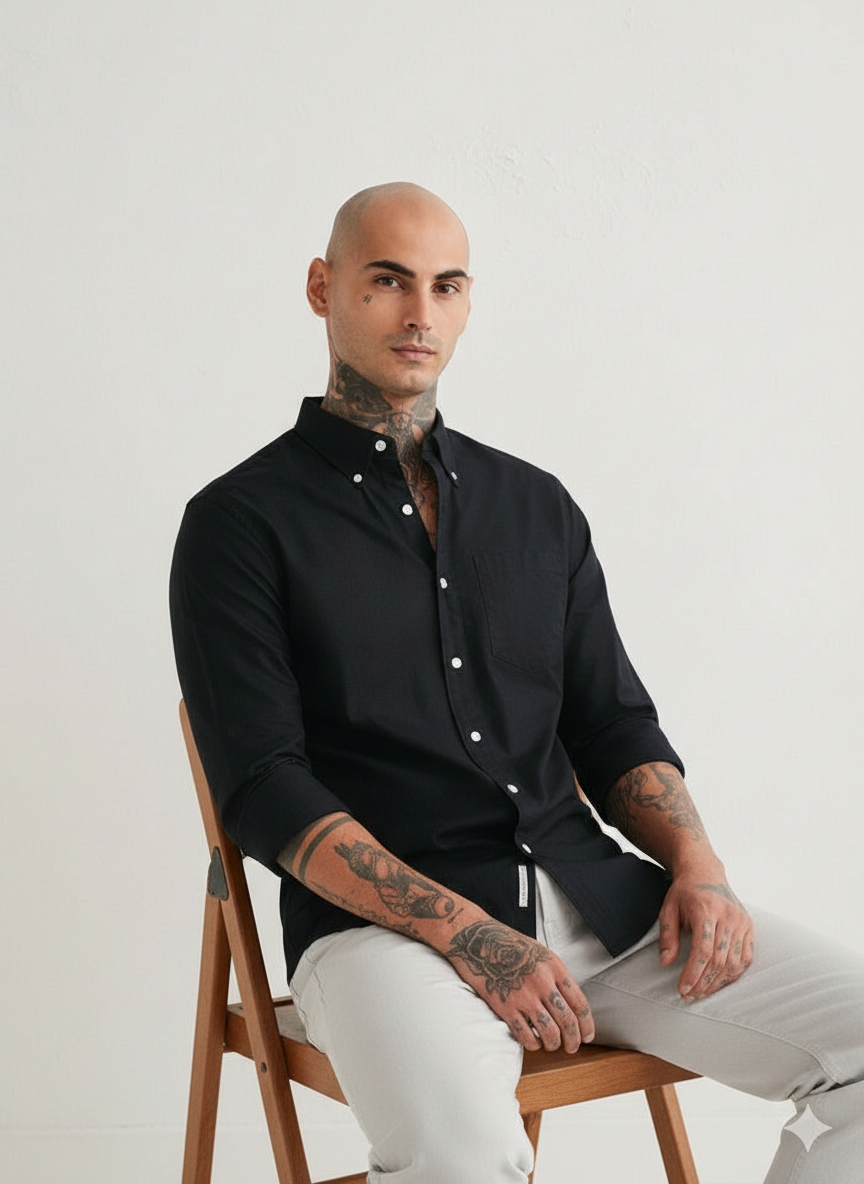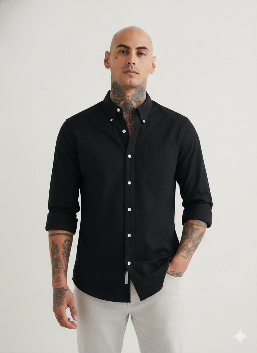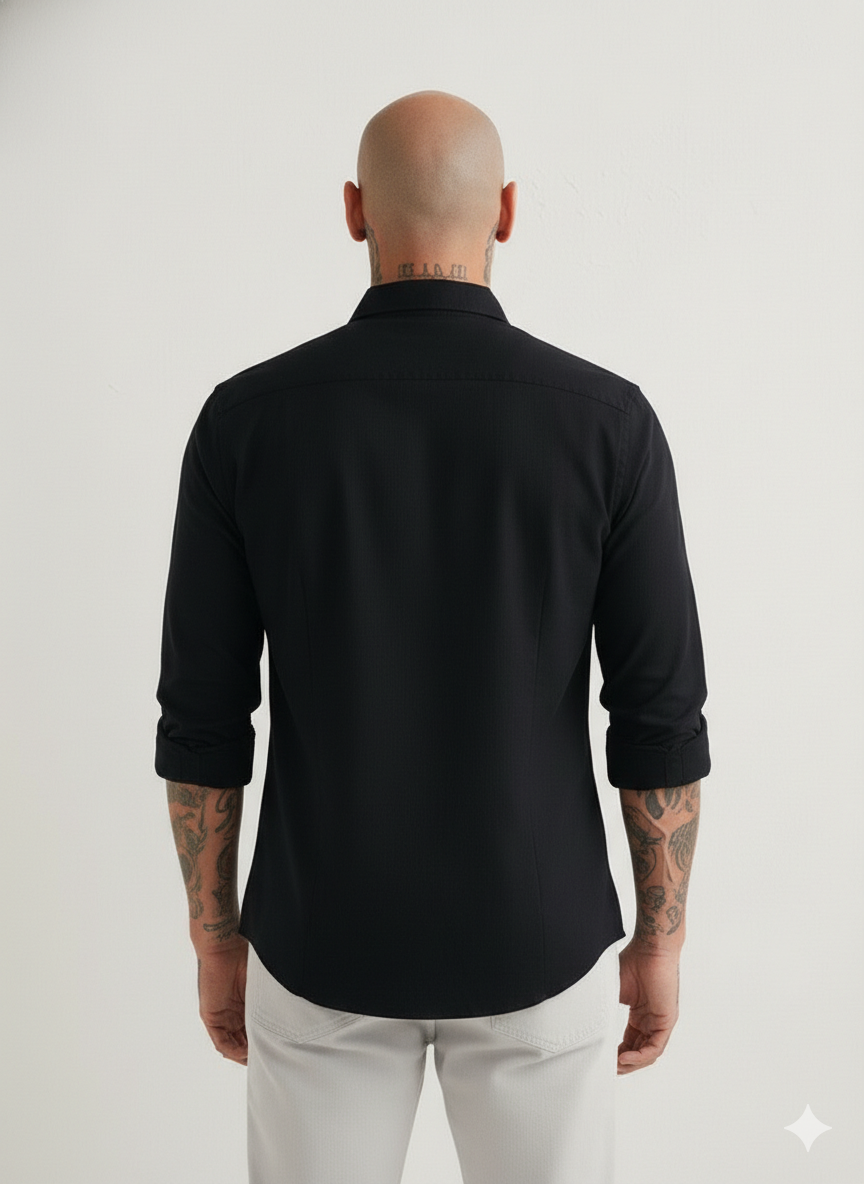 This shirt features a classic button-down collar with a full front button closure, giving it a sharp and structured appearance. The solid black colour adds a powerful and versatile touch, making it a perfect choice for casual outings, evening wear, office casuals, or smart social gatherings. Black never goes out of style, and this shirt ensures you always look confident and refined.