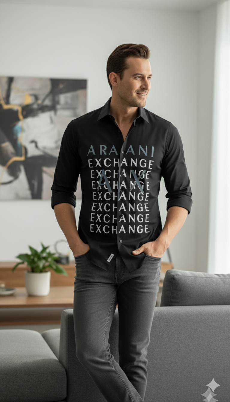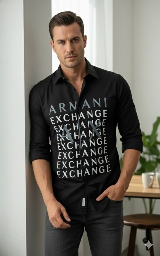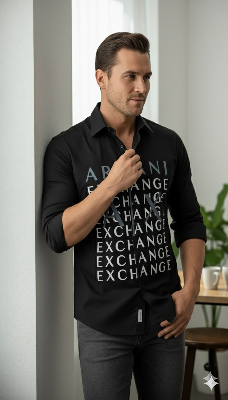 Crafted from high-quality breathable cotton fabric, this shirt offers a smooth texture and comfortable fit that lasts all day. The deep black base enhances its refined look, while the eye-catching vertical Premium Branded Shirt on the front adds a powerful designer statement. The repeated “Exchange” typography gives it a trendy, urban vibe that stands out effortlessly.